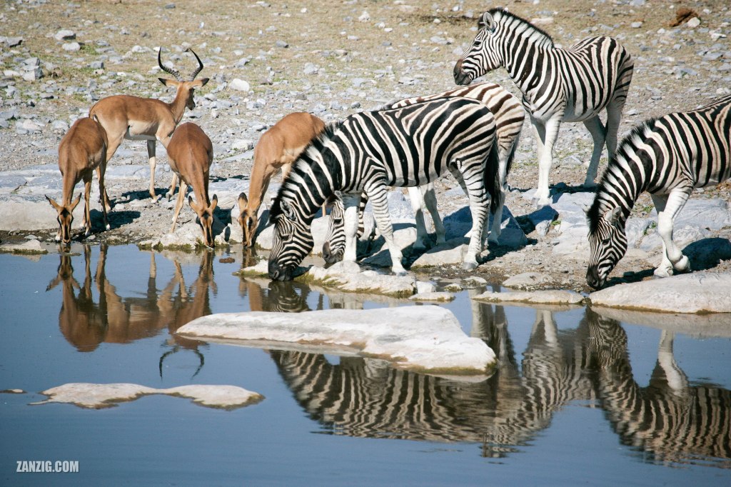 NOVEMBER 2006 – Three zebras and four impalas drink at the Moringa waterhole in Namibia’s Etosha National Park. Photo © by Mark Zanzig/zanzig.com
