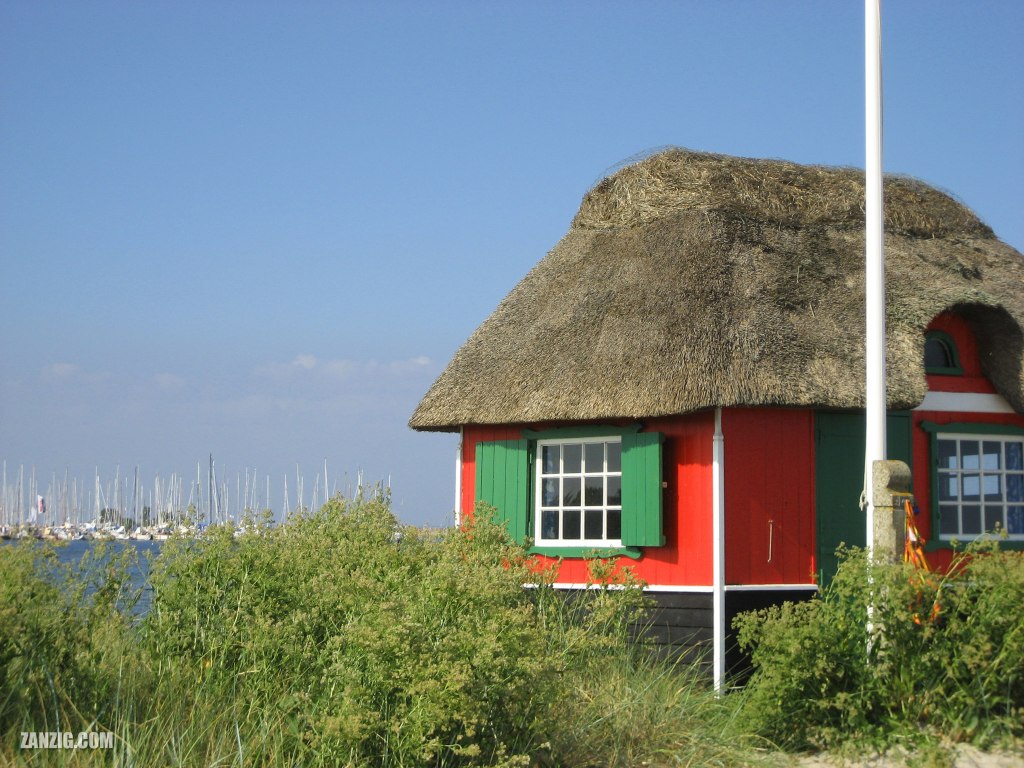JULY 2006 – The Badehusene i Marstal (“Bath House in Marstal”) is a group of historic buildings in Marstal, Denmark. They are located close to the yacht harbor, directly at the beach. This bath house has been painted in bright red and green and features a traditional straw roof. Photo © by Mark Zanzig/zanzig.com