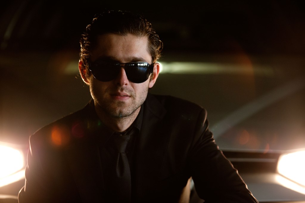 OCTOBER 2009 – Male model Edin Kamaric poses wearing a black suit and sunglasses in front of a car that has the headlights switched on. Photo © Mark Zanzig/zanzig.com
