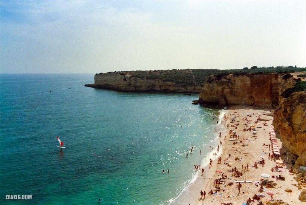 AUGUST 1987 – Busy Praia Nova at Alporchinhos, Portugal, on a sunny summer day. Photo © by Mark Zanzig/zanzig.com