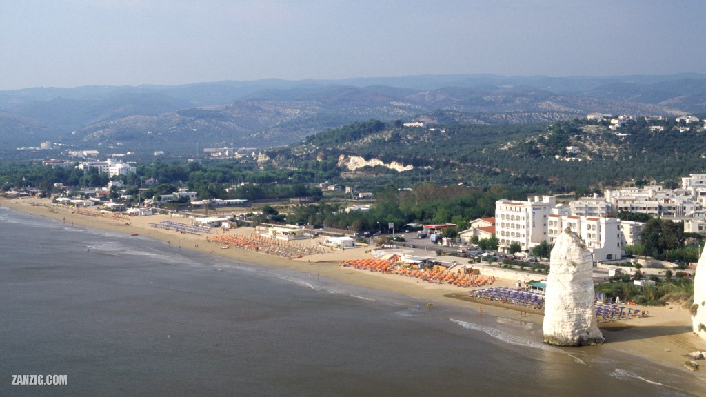 SEPTEMBER 2000 – View across the southern beach of Vieste, Italy, with its Monolite Pizzomunno prominently overtowering the beach. Photo © Mark Zanzig/zanzig.com