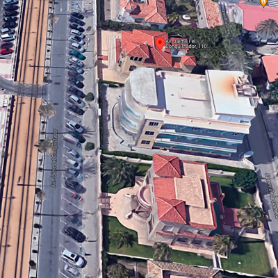 The three tourists clearly stand on the beach promenade looking north, and the photographer looks towards South, the beach is to the left. Please note the villa with the small tower and the three windows in that tower. According to aerial photography from Google Maps, this is Avenida Jaime I el Conquistador,110. Looking at the more recent Street View imagery from Google, the villa seems to have been replaced by a modern building just recently.
