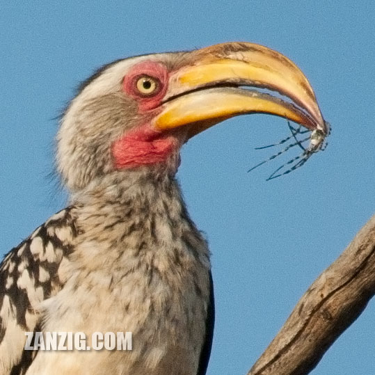 Then two southern yellow-billed hornbills (Tockus leucomelas) landed on a tree that was close enough for a full frame shot. I could see that one of the birds was biting down on a spider. And a closer examination shows the reflection of the sun in the eye. What a shot!
