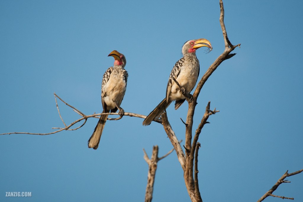 NOVEMBER 2011 – Two southern yellow-billed hornbills (Tockus leucomelas) sit on a dead tree at the Kruger National Park in South Africa. One of them carries a dead spider in his beak. © Mark Zanzig/zanzig.com