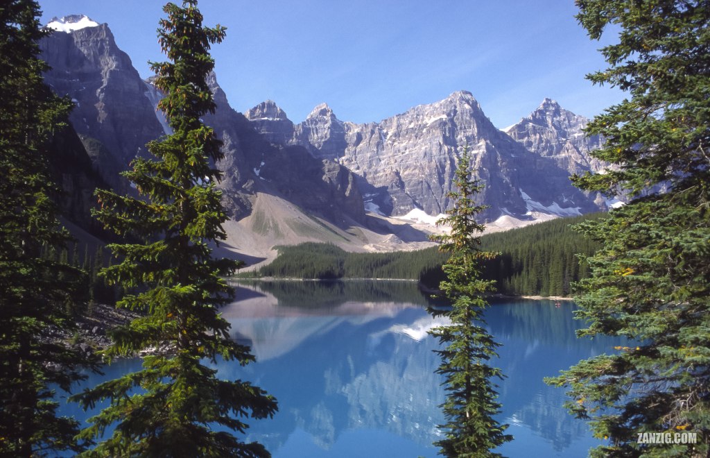 AUGUST 2002 – The valley of Ten Peaks reflects in the calm water of Moraine Lake on a beautiful summer morning in the Banff National Park in the Canadian Rocky Mountains. © by Mark Zanzig/zanzig.com
