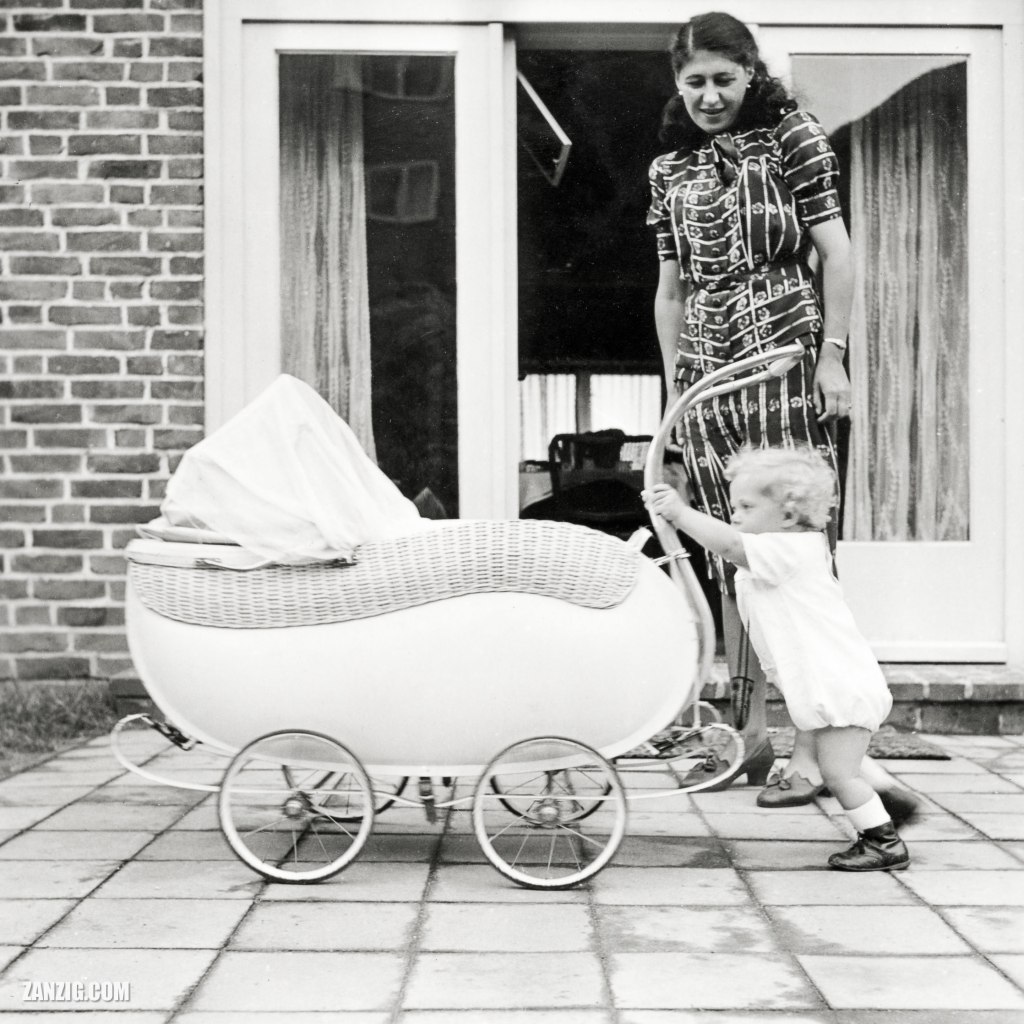 JULY 1942 – A mother watches her one year old girl push a stroller on the patio of a house in Kiel, Germany. © Mark Zanzig/zanzig.com