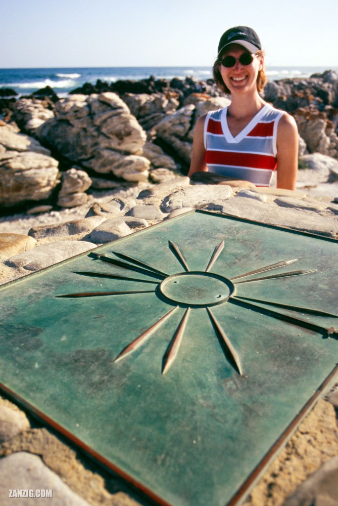 MARCH 2004 – Petra Zanzig poses at the official landmark indicating the southernmost point of the African continent near Cape Agulhas, South Africa. © Mark Zanzig/zanzig.com