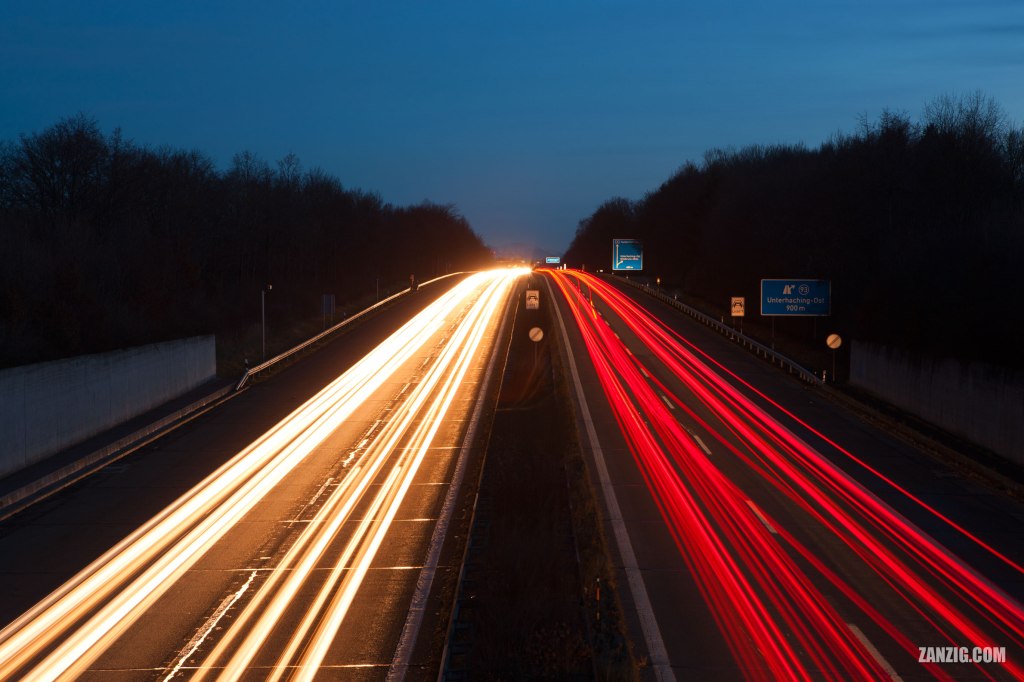 I had a bit of spare time and decided to do a shot that I had wanted to do for a long time: A long exposure of the highway A8 during the blue hour. So I grabbed a tripod and my gear bag, hopped on my bicycle and drove to a perfect location on the former Neubiberg airbase. You stand up high above the highway on a tunnel, so you have a solid base for your tripod with no chance of slight movements that you would usually experience from a bridge.