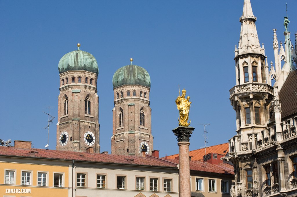 APRIL 2007 – Two icons of Munich, Germany, are shown in one image on a sunny day: The Marienstatue, and the two towers of the Frauenkirche. Photo © by Mark Zanzig/zanzig.com