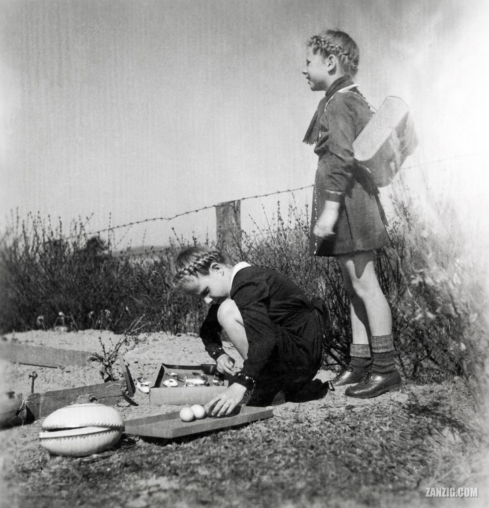 APRIL 1949 – Two kids enjoy the gifts brought by the Easter Bunny to the garden of their home in Malente-Gremsmühlen, Germany. Scan © Mark Zanzig/zanzig.com