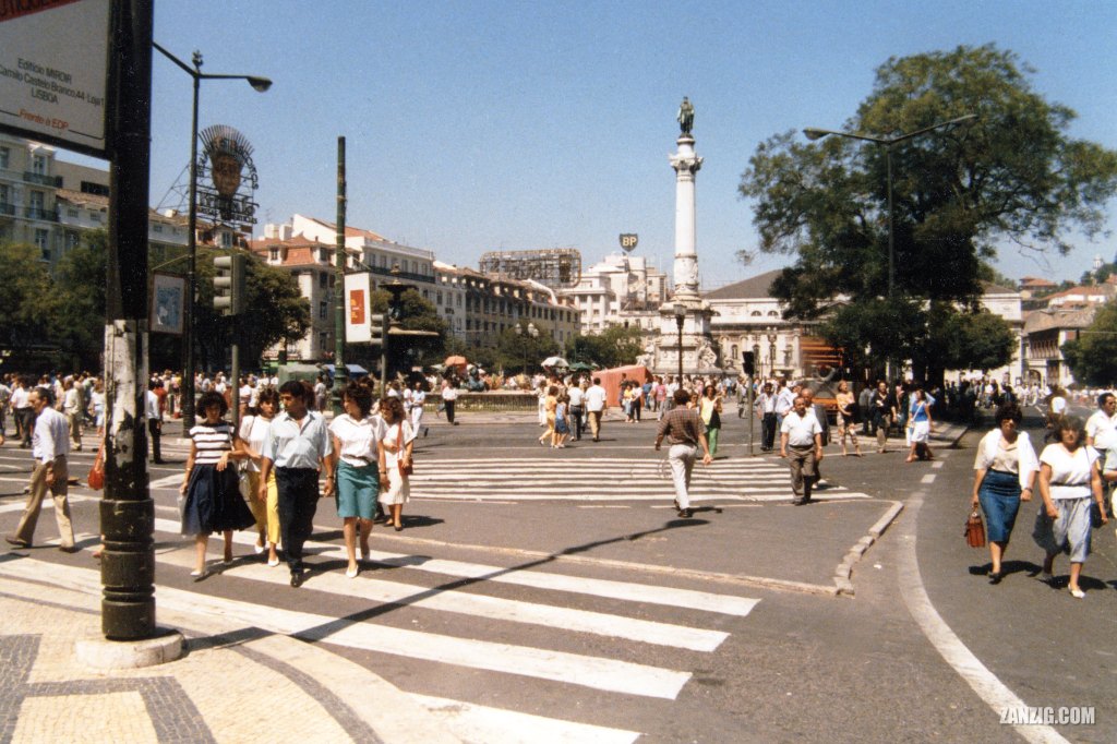 AUGUST 1988 – The busy Rossio Square in Lisbon, Portugal, with the Coluna de D. Pedro IV (Column of Pedro IV). Photo © by Mark Zanzig/zanzig.com
