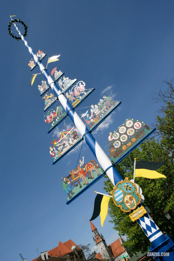 MAY 2006 – The traditional Maibaum (May Tree) marks the center of the Viktualienmarkt in Munich, Germany. Photo © by Mark Zanzig/zanzig.com