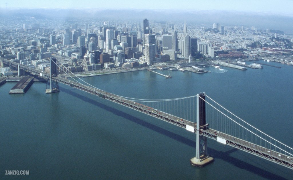 SEPTEMBER 2003 – Aerial view across the Oakland Bay Bridge and downtown San Francisco, California. Photo © Mark Zanzig/zanzig.com