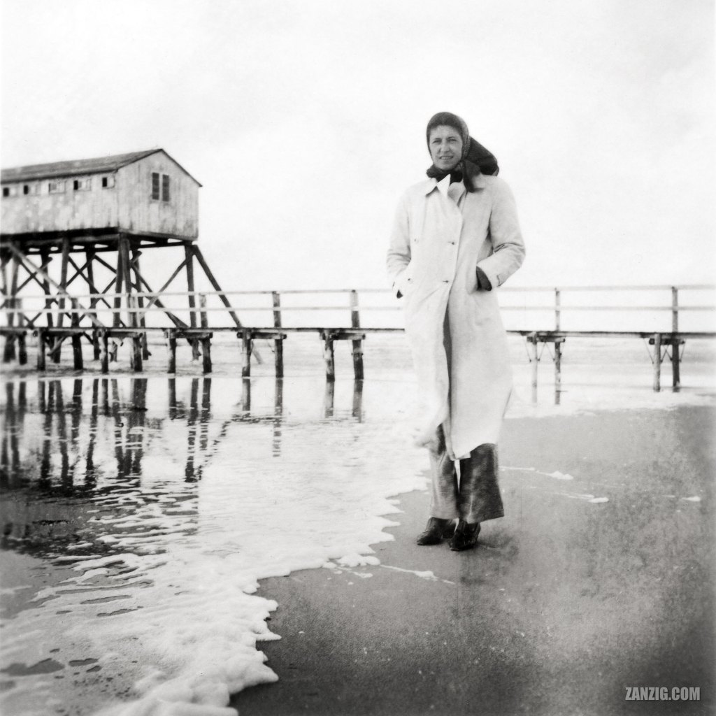 1943 – Edith Schweim walks the beach of St. Peter Ording in Northern Germany. Scan © Mark Zanzig/zanzig.com