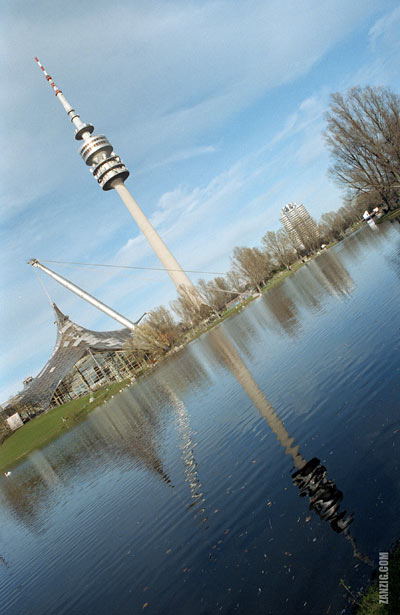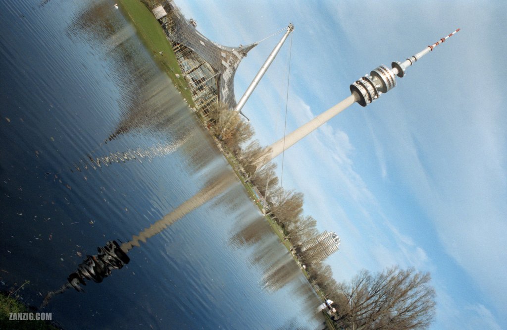 1999 – The Munich TV Tower reflects in the artificial lake of the Olympic Park. Photo © Mark Zanzig/zanzig.com