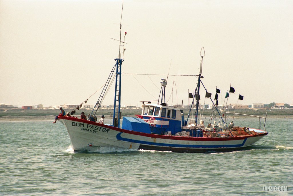 AUGUST 1988 – On a sunny morning, fishermen return to Olhao, Portugal, on their boat “Bom Pastor”. Photo © by Mark Zanzig/zanzig.com
