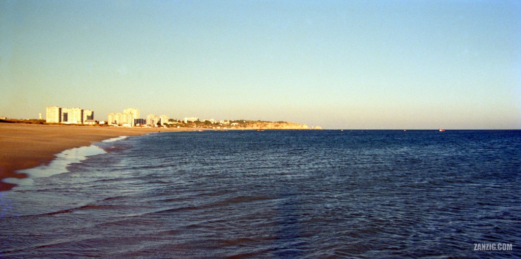 1988 – Panorama photo of Praia de Alvor, Portugal, shortly before sunset. Photo © by Mark Zanzig/zanzig.com