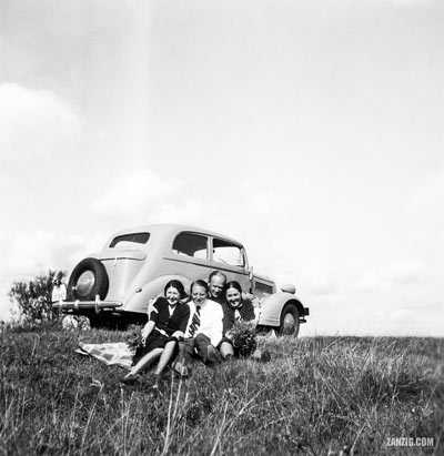 1940 – Two couples show a good mood while posing for a selfie in front of a car on a meadow in Schleswig-Holstein in Northern Germany. Scan © Mark Zanzig/zanzig.com