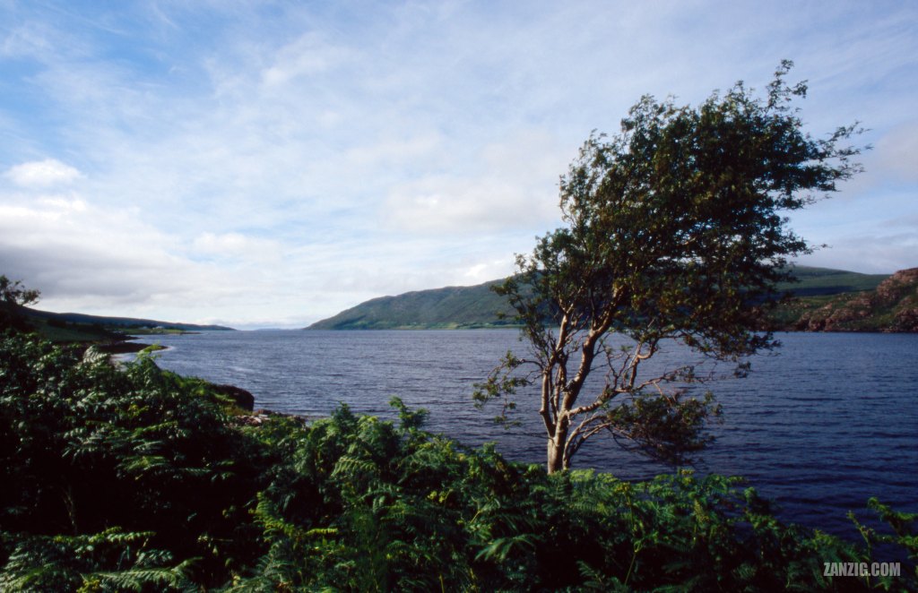JULY 2005 – A single tree stands at the western shore of Little Loch Broom in Scotland. Its top has tilted over time due to the strong winds in the area. Photo © Mark Zanzig/zanzig.com