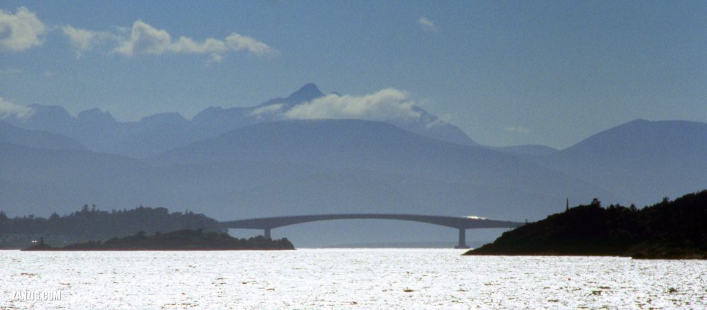 JULY 2005 – The Skye Bridge in Scotland, seen from the distance against the backdrop of the mountains of the Isle of Skye. Photo © Mark Zanzig/zanzig.com