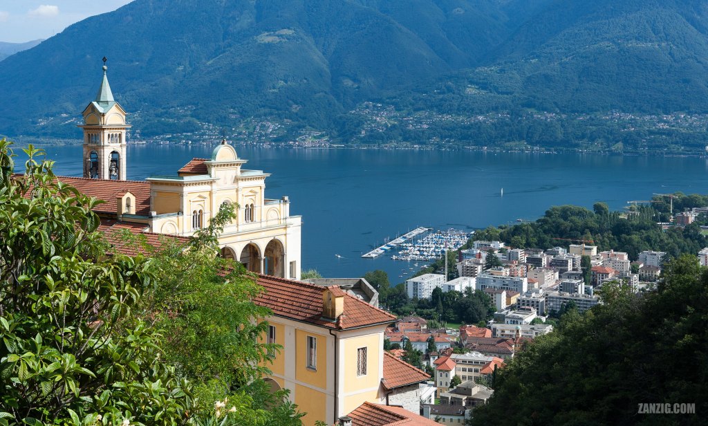 This image, for example, shows Madonna del Sasso in Orselina, Switzerland, a sanctuary and pilgrimage church that sits high above the city of Locarno in the mountains, overlooking the northern part of the lake. The sanctuary was founded after a vision of the Virgin Mary in 1480 and quickly became a popular destination for pilgrims. It can be reached directly from Locarno through the Locarno-Madonna del Sasso funicular and offers beautiful views across the lake and the city.