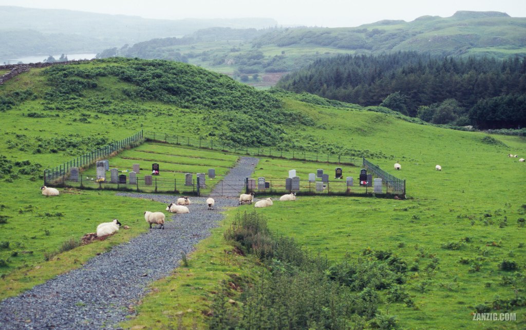 JULY 2005 – Sheep next to a fenced graveyard near Dervaig on the Isle of Mull, Scotland. © Mark Zanzig/zanzig.com