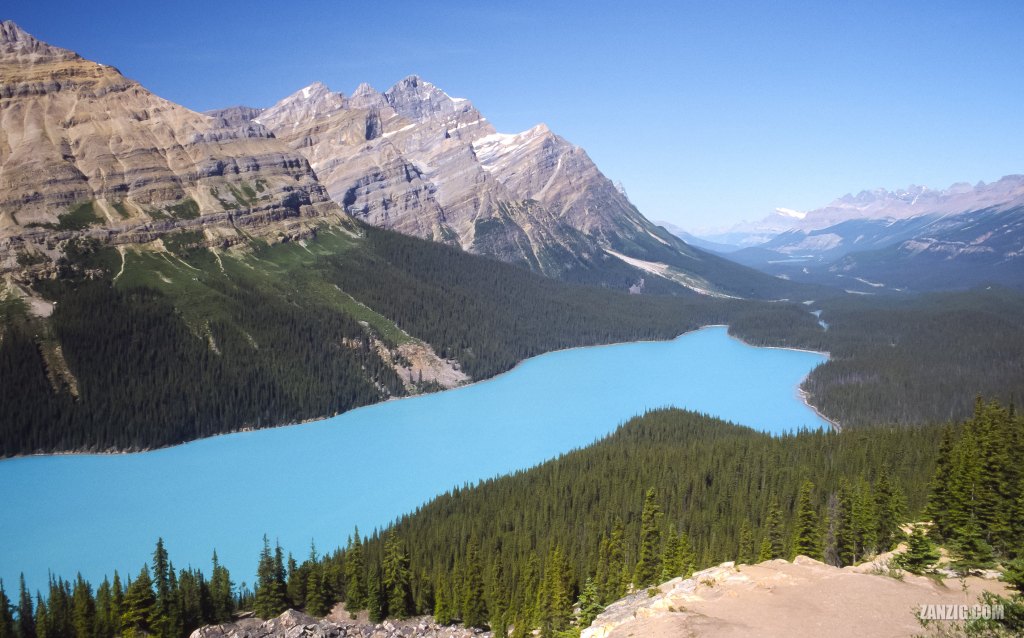 AUGUST 2002 – The turquoise water of Peyto Lake in the Banff National Park, Alberta, Canada on a sunny day. Photo © Mark Zanzig/zanzig.com