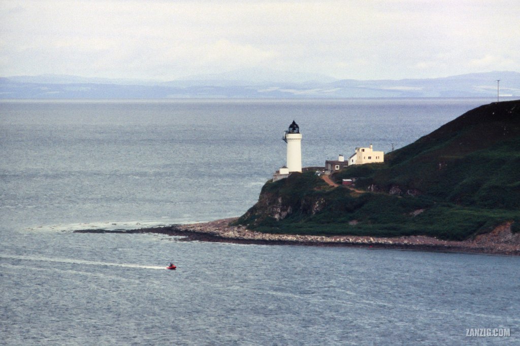 JULY 2005 – A rubber speedboat rushes by Davaar Lighthouse near Campeltown, Scotland. © Mark Zanzig/zanzig.com