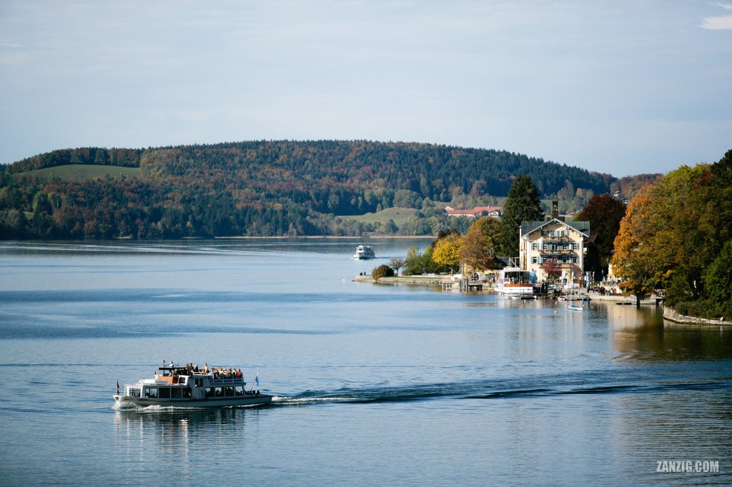 I took this photo of Lake Tegernsee on a beautiful and warm autumn afternoon. Incredibly, some of the passengers on the small excursion boat wear just T-shirts, but all of them enjoy the afternoon sun. The building in the right is the town hall of Tegernsee, the small, but busy, community that has adopted the name of the lake for their village.