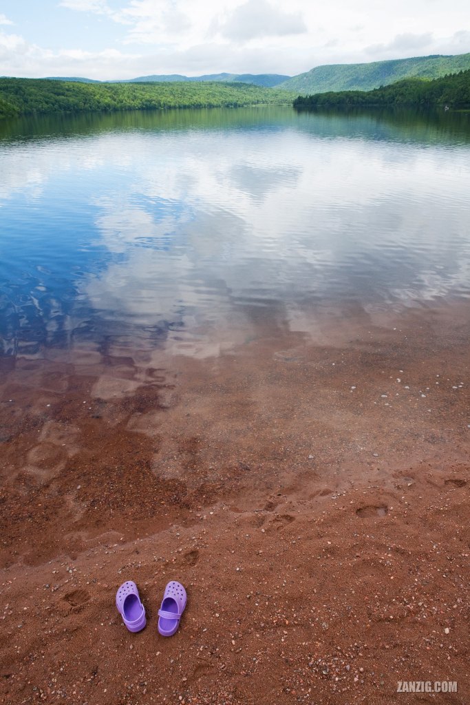 JULY 2009 – Purple manmade clogs have been left by a swimmer at Warren Lake in Cape Breton, Nova Scotia, Canada. © Mark Zanzig/zanzig.com