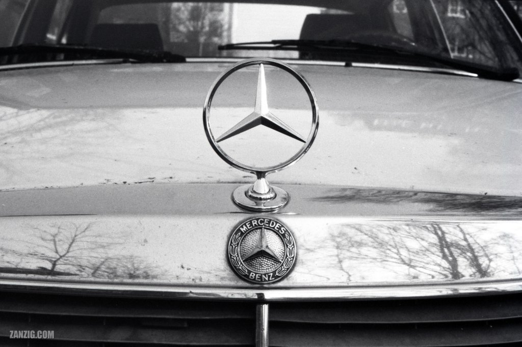 1989 – Black-and-white photo of the iconic star hood ornament badge of a Mercedes Benz W123 car. Photo © Mark Zanzig/zanzig.com