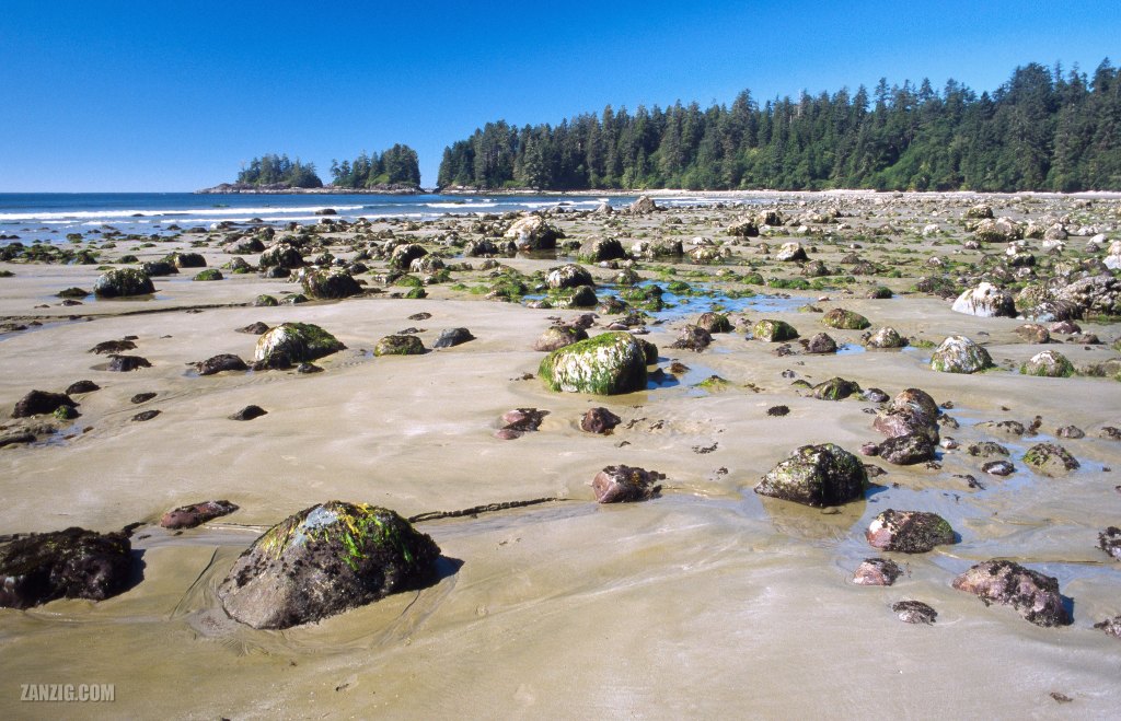 AUGUST 2002 – During ebb, countless rocks emerge from the sand at Schooners Beach near Tofino on Vancouver Island, British Columbia. Photo © Mark Zanzig/zanzig.com
