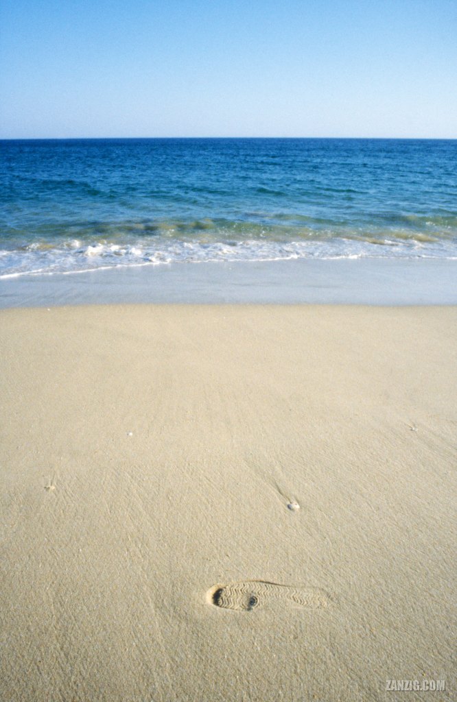 JUNE 1995 – A single footprint of a sneaker shows in the wet sand of a beach. Photo © by Mark Zanzig/zanzig.com