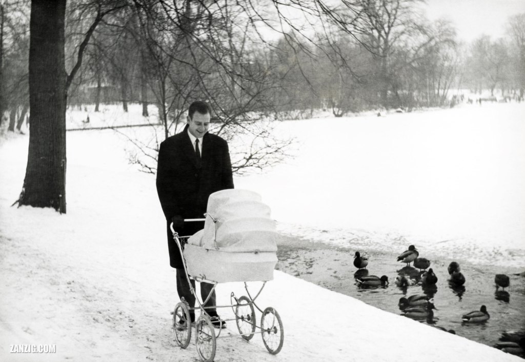 JANUARY 1966 – Klaus Zanzig pushes a stroller along a snow covered path of the Schrevenpark in Kiel, Germany. © Inga Zanzig/zanzig.com