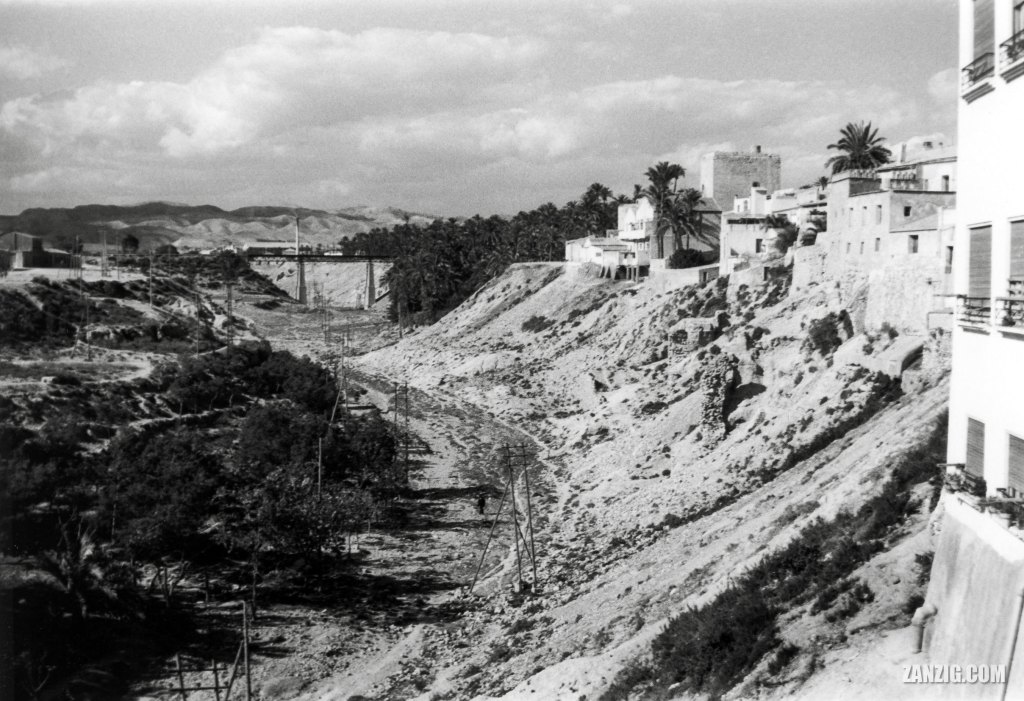 APRIL 1957 – View across the river bed formed by the Rio Vinalopó in Elche, Spain. Scan © Mark Zanzig/zanzig.com