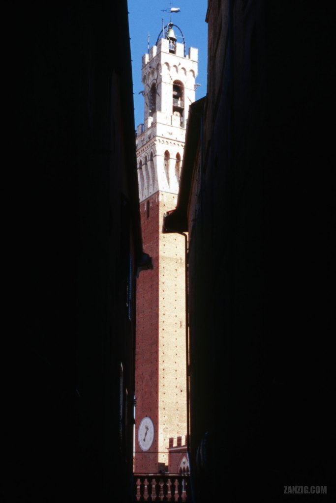 AUGUST 2000 – The tower of the Palazzo Pubblico (Mayor’s Office) in Siena, Italy, seen from the Chiasso del Bargelle, one of the many narrow streets surrounding the famous Piazza del Campo . Photo © Mark Zanzig/zanzig.com