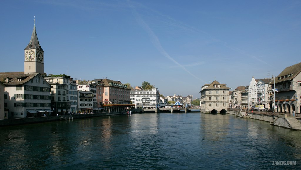 OCTOBER 2005 – View from the Münsterbrücke in Zurich, Switzerland, along the River Limmat with the historic church St. Peter on the left and the Rathausbrücke in the center. © Mark Zanzig/zanzig.com