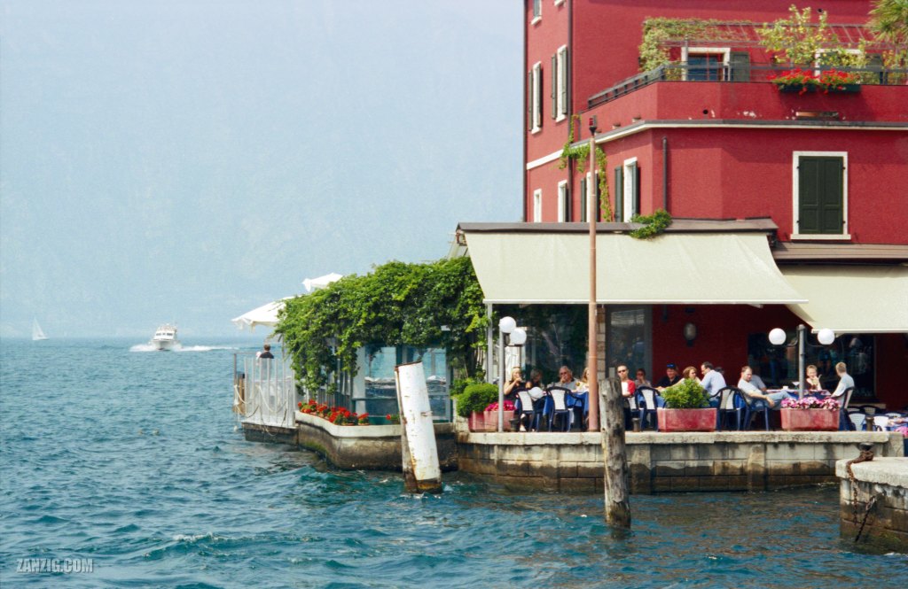 JUNE 2001 – The Caffe Ristorante Pizzeria Italia da Nikolas is situated directly at the tiny harbour of Malcesine in Italy. Photo © by Mark Zanzig/zanzig.com