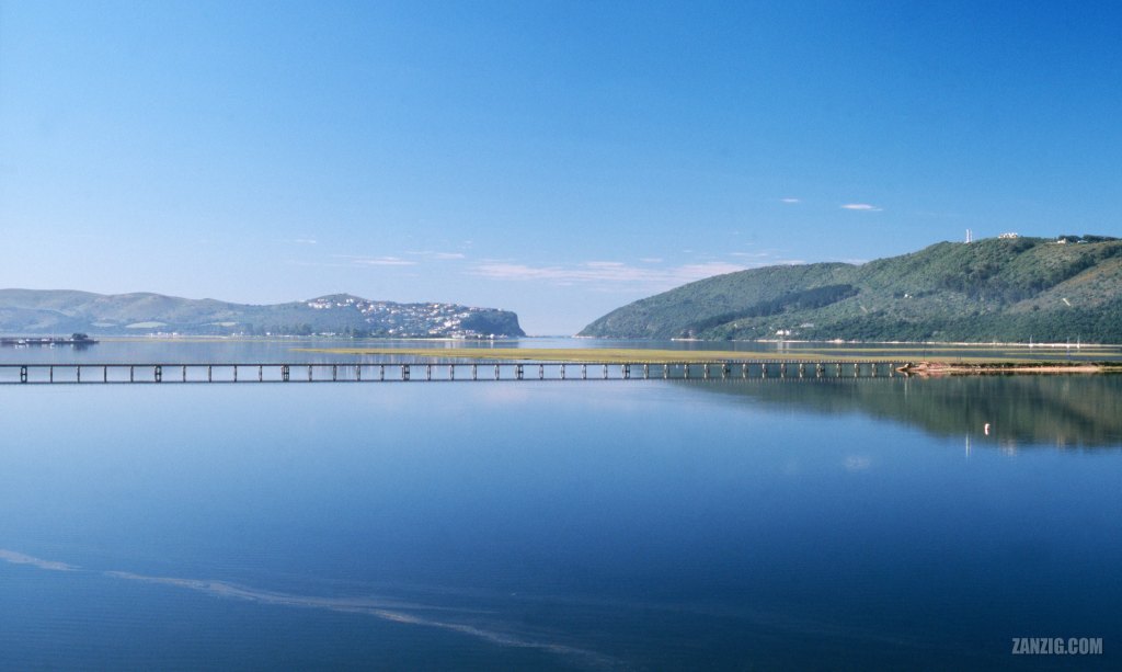 MARCH 2004 – The mirror like water of the Knysna Lagoon in South Africa reflects the blue sky and the old railway bridge. The passage towards the Indian Ocean known as ‘The Heads’ can be seen in the distance. © Mark Zanzig/zanzig.com