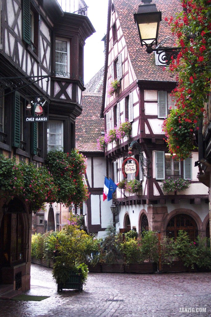 Aas it had rained earlier, there were just very few tourists on the streets, and I found this building – the restaurant Le Fer Rouge – very attractive. It seems to be still the original building. Back in 2001, plants surrounded the patio. The plants have gone, but the restaurant is still in operation (just as the Chez Hansi opposite.)