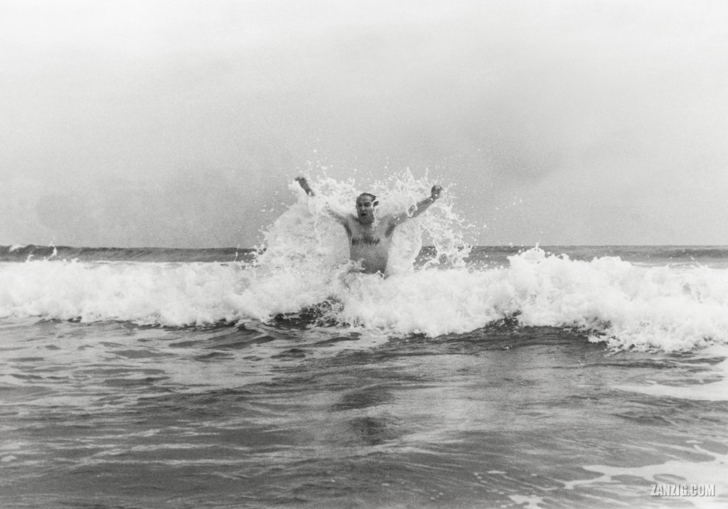 APRIL 1957 – A man emerges from the waves of the Mediterranean Sea at the beach of San Juan in Spain. Scan © Mark Zanzig/zanzig.com
