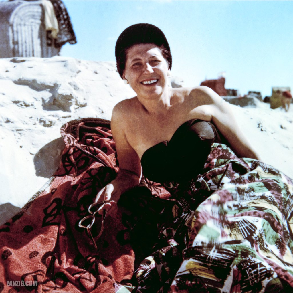 SUMMER 1956 – A color photo shows Edith Schweim at the beach of St.-Peter-Ording in Germany. © Mark Zanzig/zanzig.com