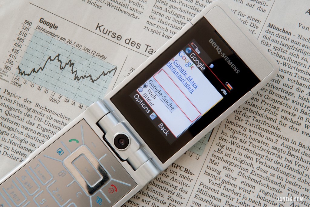 JULY 2006 – A BenQ Siemens EF81 mobile phone shows a Google search page in front of a newspaper showing the chart of the Google stock. Photo © Mark Zanzig/zanzig.com