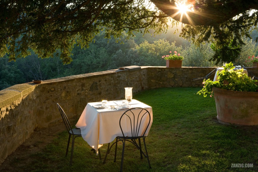 AUGUST 2008 – The setting sun illuminates a dinner tables at the Dievole Wine Resort in Vagliagli, Italy. © Mark Zanzig/zanzig.com