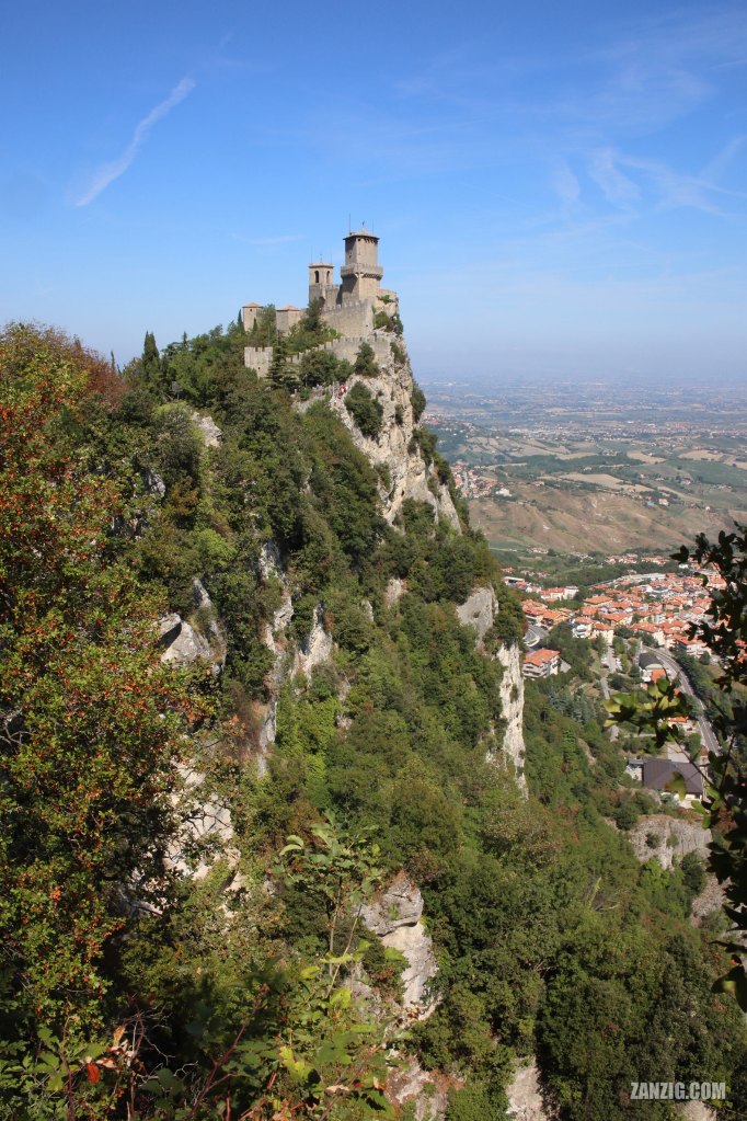 This photo shows the Guaita Tower, also known as ‘The First Tower’ (of three), photographed from the view point near the second tower. Right below the tower you can spot the Passo delle Streghe, a series of narrow, steep stairs. The area on the right is the Borgo Maggiore neighborhood which also belongs to San Marino. It the distance you can see the coastline of the Mediterranean Sea which belongs to Italy.