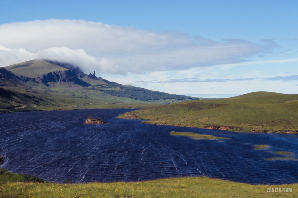 A strong wind was blowing when we were exploring the northern part of the Isle of Skye in Scotland. We stopped at Loch Fada for several photos. This image shows the Loch from its southern end. In the back you can see The Old Man of Storr, the needle-like rock formation which measures 50 meters (165 feet) in height. The mountain is 718 meters (2358 feet) high.