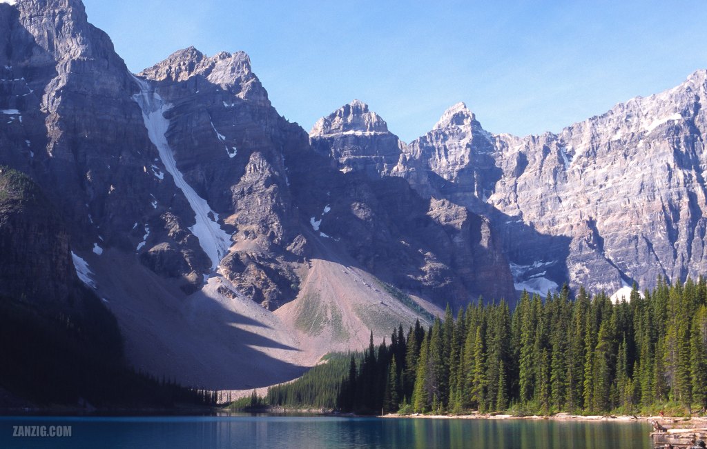 AUGUST 2002 – The Ten Peaks overtower Moraine Lake on a beautiful morning in the Banff National Park in Canada. © by Mark Zanzig/zanzig.com