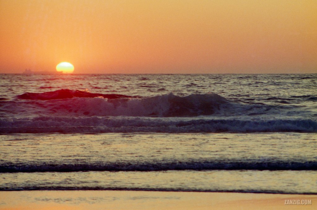 AUGUST 1988 – The shape of a large freight ship can be seen at the horizon during sunset in Portugal. © Mark Zanzig/zanzig.com