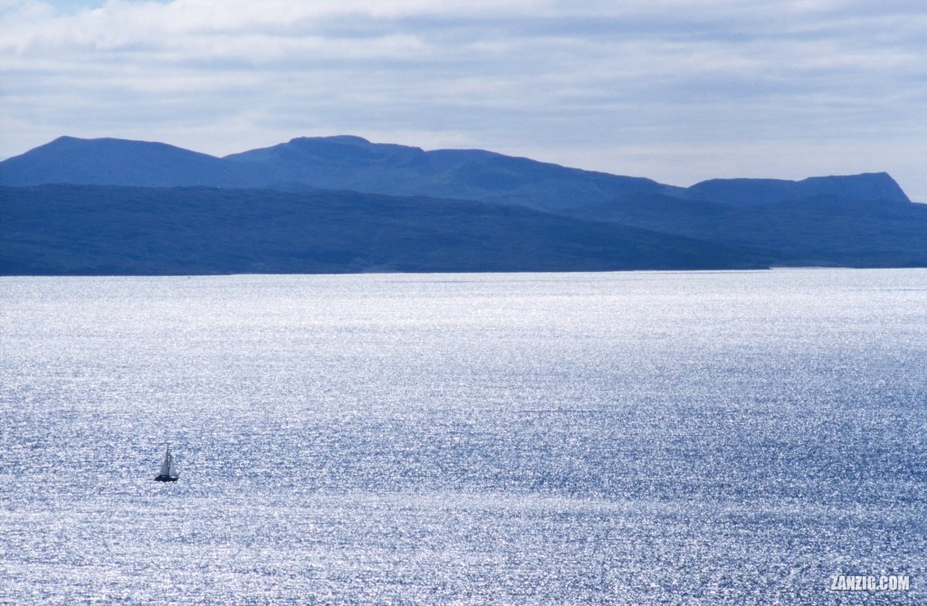 JULY 2005 – A single yacht sails across the sea, seen from Elgol on the Isle of Skye in Scotland, with the mountains of the Isle of Rum in the background. Photo © Mark Zanzig/zanzig.com