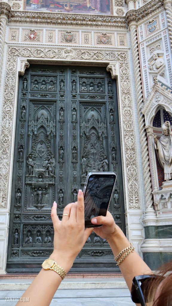 The Cattedrale di Santa Maria del Fiore is the key attraction for many tourists. Every day of the year, thousands of visitors come here to enjoy the beauty of the place and inhale its history. It is difficult to not bump into a tourist. And yes, we were tourists, too, and did what had to be done: taking photos, just like this lady that captures the front of the Dome with her smartphone.
